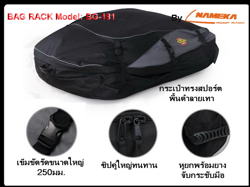 BG-181 BAG RACK กระเป๋า แร็คหลังคา NAMEKA กันน้ำ ดีไซส์ใหม่ ทรงสปอร์ต ขอบโค้งมน ลดแรงต้านลม พื้นกระเป๋าสีดำ ลายด้านข้างตัดด้วยสีเทา ดูสวย มีสไตล์ ไม่ซ้ำใคร ซิปขนาดใหญ่ ใช้งานสะดวก เปิด-ปิด กว้างได้ถึงกัน 3 มุม